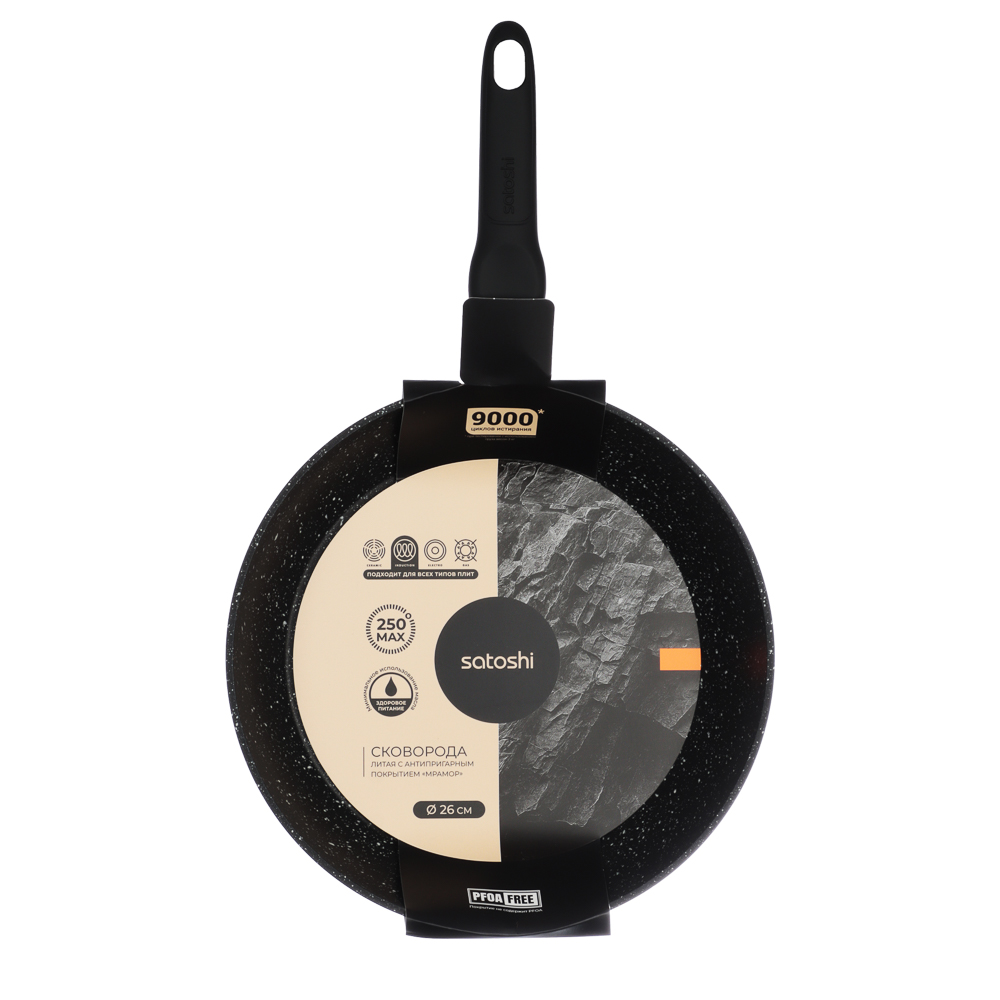 Сковорода литая диаметром 26 см SATOSHI Стоун – современная и удобная кухонная посуда для ежедневного приготовления. Изготовлена из прочного литого алюминия с антипригарным мраморным покрытием, выдерживающим до 9000 циклов истирания. Покрытие обеспечивает равномерное распределение тепла и позволяет готовить с минимальным количеством масла, сохраняя натуральный вкус продуктов. Сковорода безопасна для здоровья — не содержит PFOA. Подходит для всех типов плит, включая индукционные, и выдерживает нагрев до 250 °C. Оснащена удобной фиксированной ручкой с петлёй для подвешивания, что облегчает хранение. Черный цвет и стильный дизайн делают сковороду гармоничным дополнением к любой кухне. Надёжная, долговечная и практичная — сковорода SATOSHI Стоун станет незаменимым помощником в приготовлении вкусных и полезных блюд.